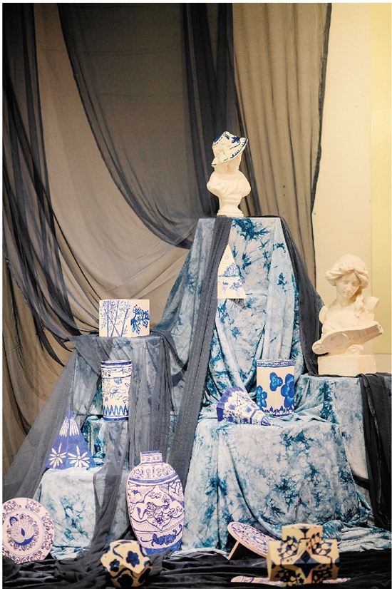 | 宁波市爱菊艺术学校集体创作 《中国有“画”说》 作品说明:作品以青花瓷为灵感内核,将传统陶瓷美学解构重组,构建出古典与现代交融的东方艺术空间。以青花钴料的靛蓝为灵魂色相,提炼元青花的苍茫、明青花的雅致,凝练成独特的视觉语言。突破传统陶瓷展陈模式,以青花瓷基因片段为密码,在展墙营造山水意境平面构成,于地面铺设釉里红效果互动投影,空中悬挂仿若青花残片的发光装置,形成三维度渗透的陶瓷美学场域。那些被解构的龙纹凤藻不再依附器物本体,而是以独立符号游走于空间缝隙,在当代语境中续写“瓷上江山”的文化史诗。 |