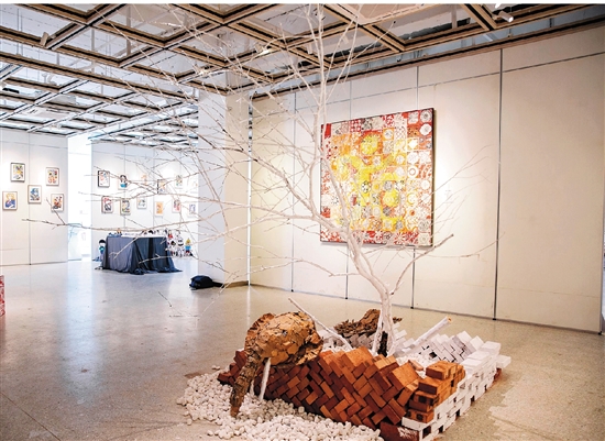 | 宁波市爱菊艺术学校集体创作 《生生不息》 作品说明:这是一组学生集体创作的环保主题艺术装置,以童真视角诠释生命轮回的奥义。作品中央矗立的“生命之树”用废弃课本卷制而成,粗糙的纸张肌理模拟年轮生长,枝头垂落的再生纸藤蔓随风轻晃,仿佛在呼吸间传递自然脉动。树下错落排列的动物家族——穿山甲蜷缩成防护姿态,鳞片由层层叠叠的快递箱瓦楞板拼贴;狮子昂首咆哮,报纸揉捏的鬃毛张扬着草食者的威严,每件作品都凝结着孩子们对生态链的稚拙理解。 |