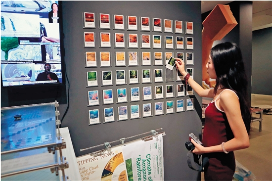 上海巡天艺术与科技展展览现场,观众查看《连极动态》数据墙
