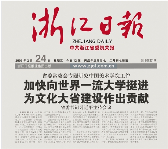 2006年2月23日,时任浙江省委书记习近平同志主持召开浙江省委常委会会议,专题研究中国美术学院工作,强调要按照加快建设文化大省的要求,积极支持中国美术学院加快向世界一流大学目标挺进,并指出中国美术学院作为全国重点高等艺术院校,处于文化和教育的交汇点,既是“文化大省”建设的生力军,又是“教育强省”建设的排头兵。