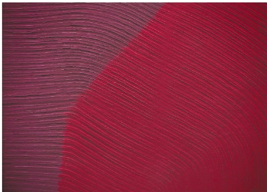 | ▲拉乌尔·乌巴克(德国) 红色大地(红色) 作品中的红色有两种色彩,靠左边的是暗红。靠右边的是一片深红的色彩,给人感觉非常沉稳、厚重。它们是被一条折线分开的,看起来不像一块土地。但是,无数的机耕田垄,在这片红土地上画出了一条条富有美感的弧线,把画面统一起来了,这是艺术家在颜料上刻出的线条,是技法上的大胆创新,正是这一条条的田垄,让画面有了肌理的变化,自然而优美,纯净而又神圣,这正是作者心目中的“农夫所创的第一旋律”,让我们更加崇敬大地、亲近自然。 |