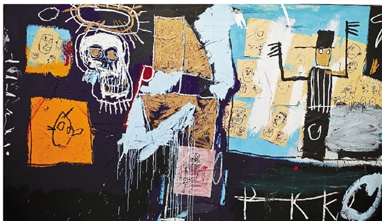 巴斯奎特是一位黑人艺术家,在这张涂鸦式的作品中,再现了被白人掩盖了的丑恶历史:无数的黑人奴隶在历史上被拍卖。画面上一张张被贴上去的黄色纸张,上面是一个个奴隶的头像,一个头戴礼帽的奴隶主在高声地叫卖着。骷髅象征着死亡,大面积的黑色让画面更加恐怖——这正是画家对奴隶拍卖强烈的控诉,也是对这一罪恶历史的正义审判。